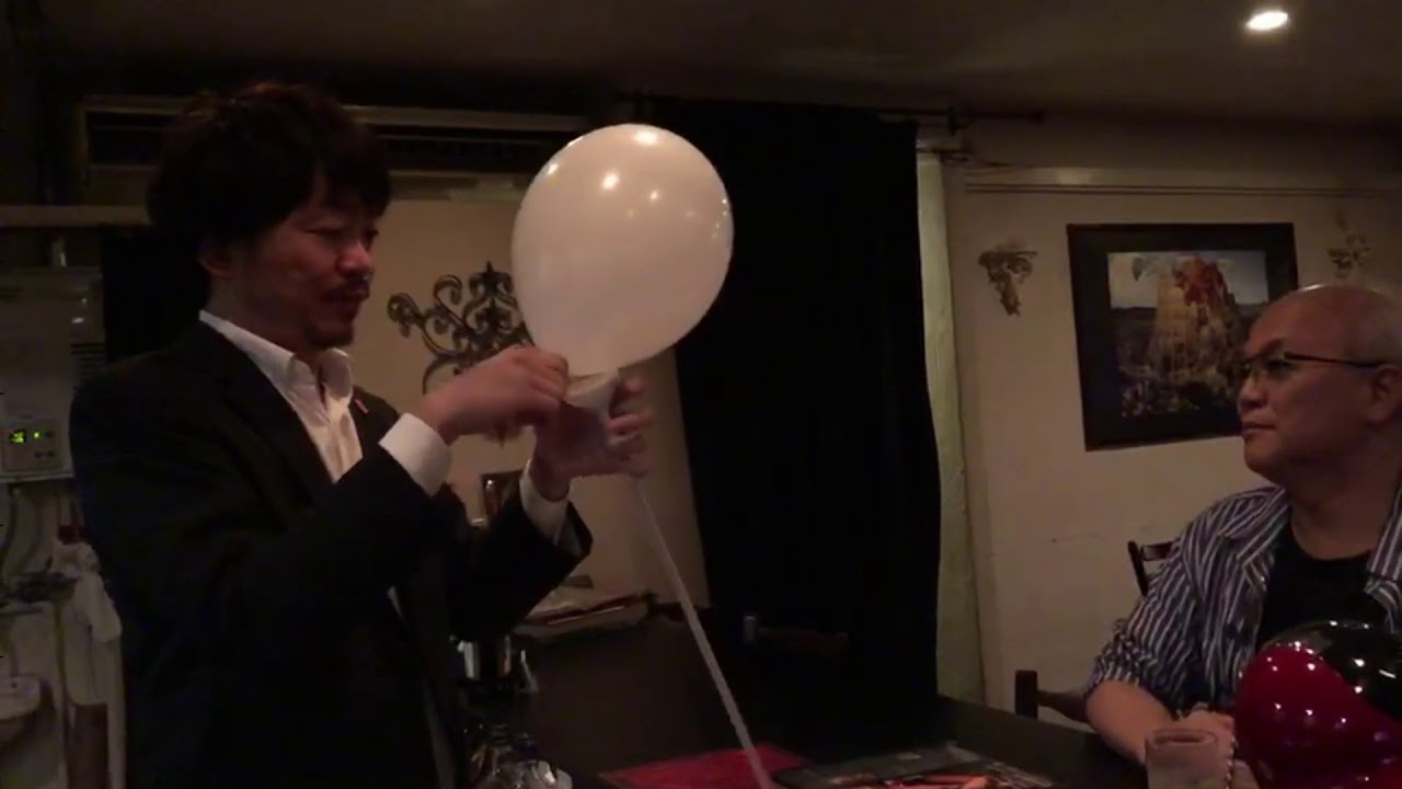 観客の目の前で風船を膨らませます。