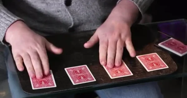 Blanketyhas less to do with blankets than the name might suggest. It is, in fact, one of the most ASTONISHING assembly effects we’ve ever seen. Four Jokers are covered with some blank cards, and one by one, they visually ‘jump’ across to the packets, each vanishing from its own space and appearing in the next one along, until all four of them assemble into the last packet… or do they? Is this vague language concealing a HUGE kicker finish! Maybe! (Spoiler alert – it is.)