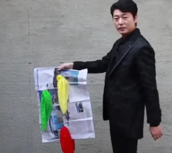 Three 45cm pieces of silk appear from holes punched anywhere in a large newspaper that has been turned over.