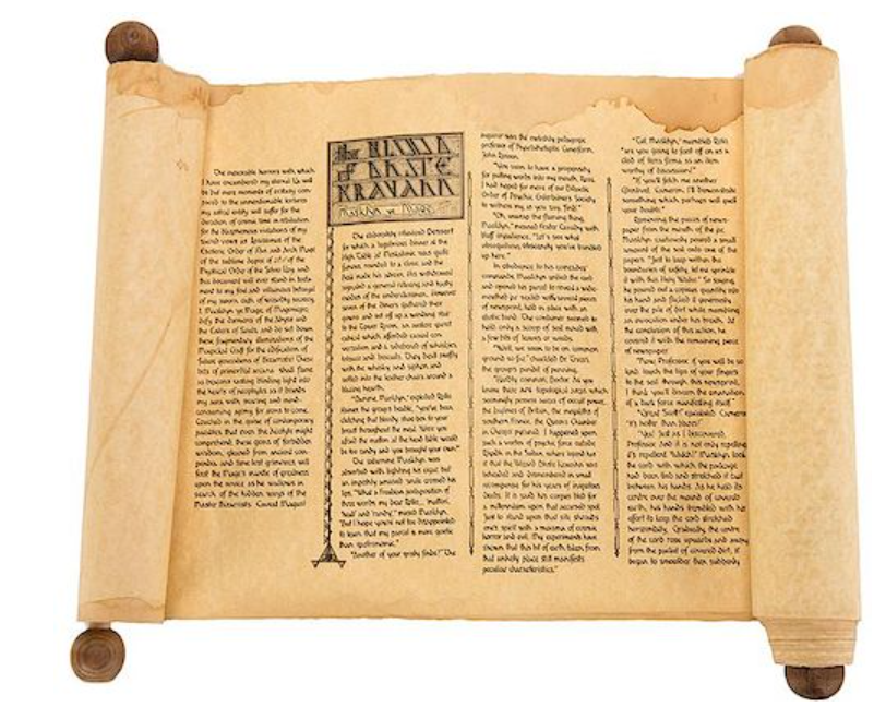 Andruzzi, Tony (Tom Palmer). The Legendary Scroll of Masklyn Ye Mage. [Chicago], ca. 1975. Handmade scroll with wooden handles, explaining many of Andruzzi’s “bizarre” magical effects. From a limited edition. Margins soiled, as issued to appear aged.